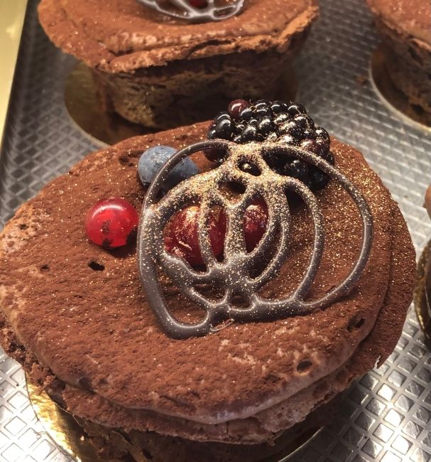 Fransk chokolade mousse hvor bunden er bagt og den lækre chokolade mousse er på toppen .