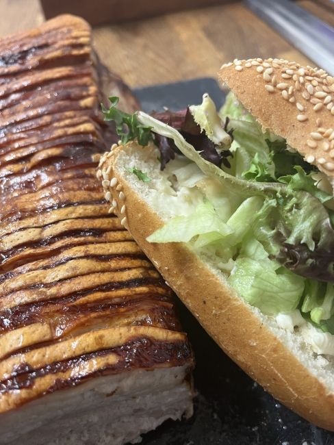 Lækker ribbenstegs sandwich i vores lækre lyse sandwichbolle(kan også godt fåes i de grove sandwichboller) smurt med salatmayo,salat , friskstegt ribbensteg, rødkål og drueagurker i skiver.